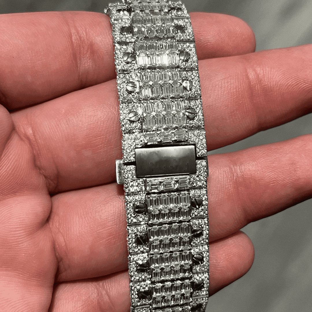 - Iced out with D-color, VVS moissanite stones