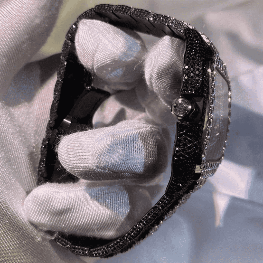 An iced out watch is a timepiece fully encrusted with sparkling stones across the case, bracelet, and dial. The watch glitters from every angle, giving the wearer an instant boost of confidence and presence.