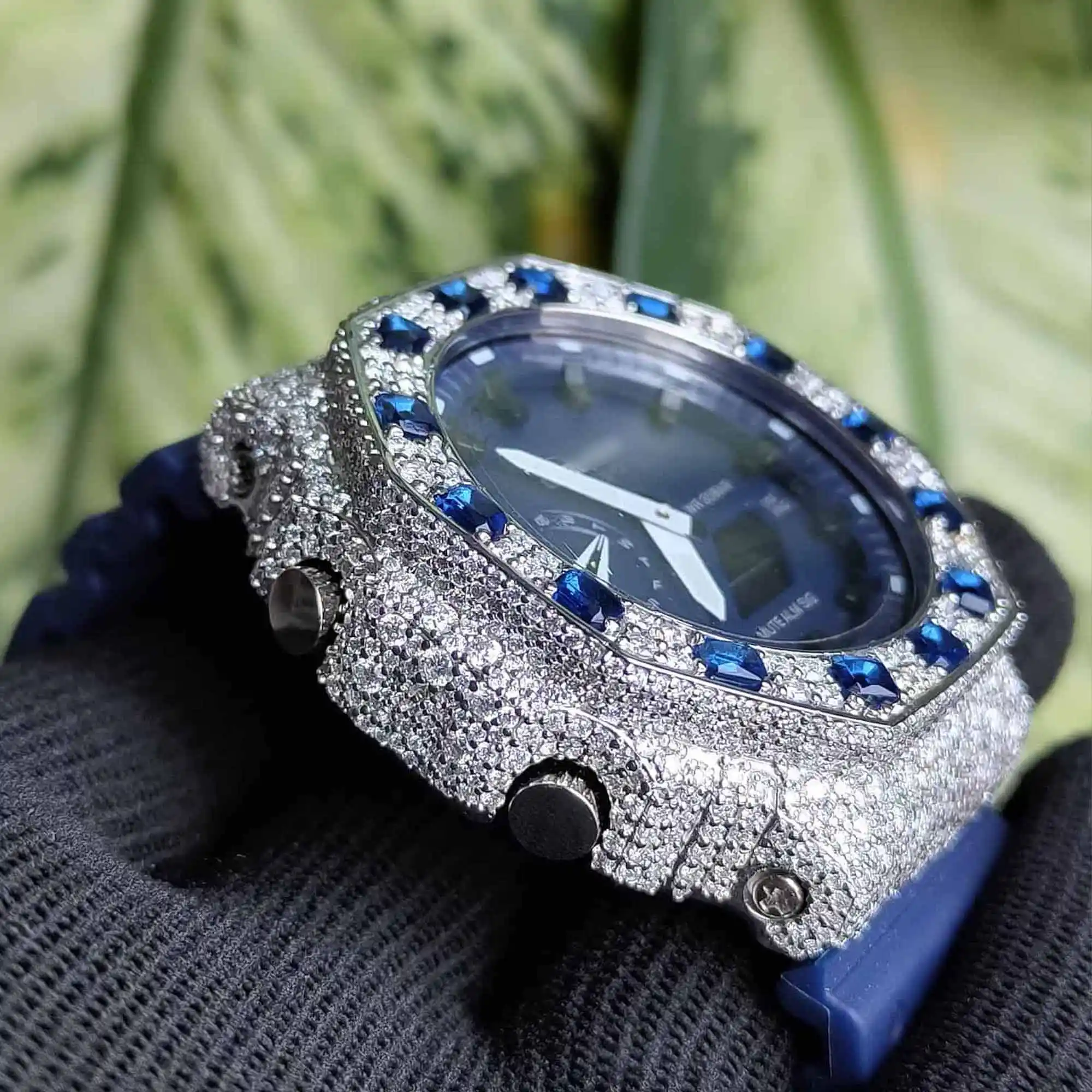 - Signature Bezel: Features 12 vibrant, baguette-cut blue lab-sapphires as hour markers on the iced-out octagonal bezel.