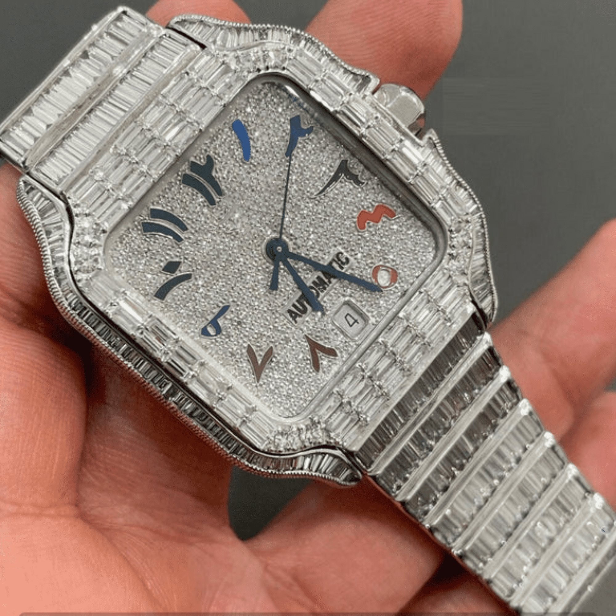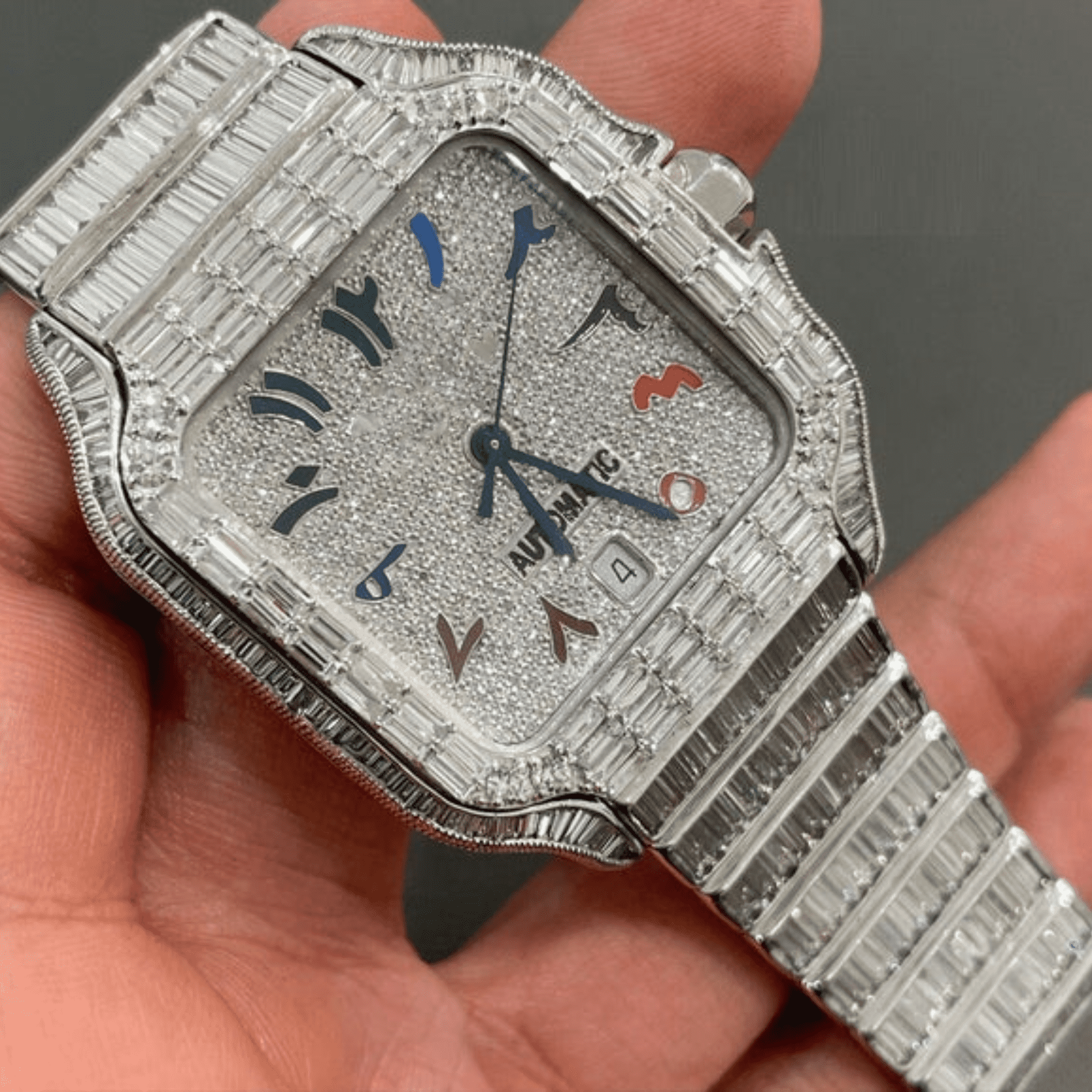 IcedJewelz Full Baguette Bezel Arabic Watch – VVS Moissanite Rainbow Dial Bust Down