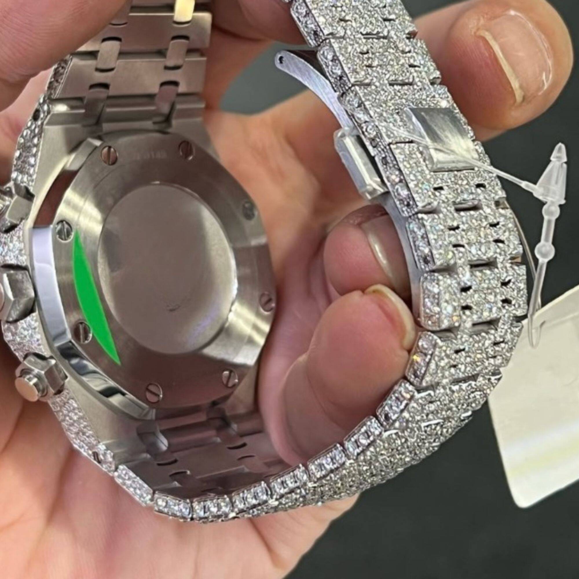 - Iced out with D-color, VVS moissanite stones