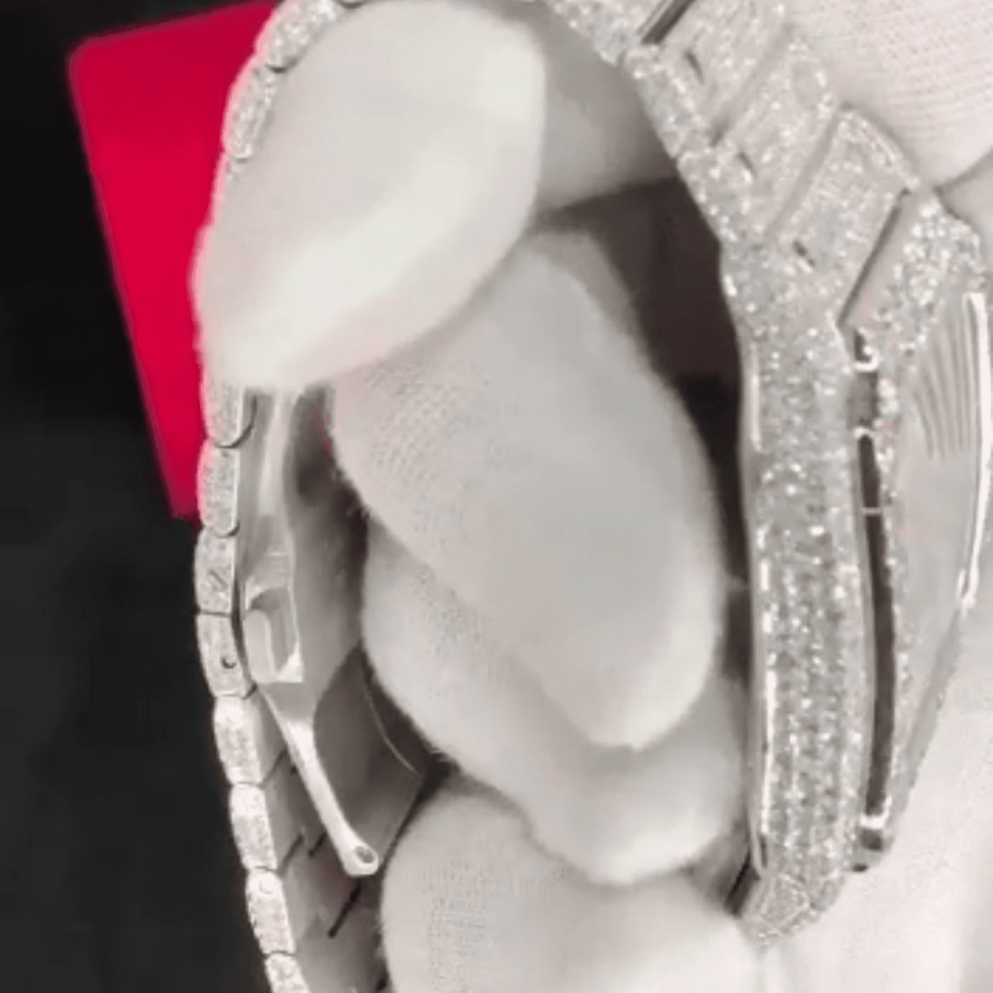 - Iced out with D-color, VVS moissanite stones