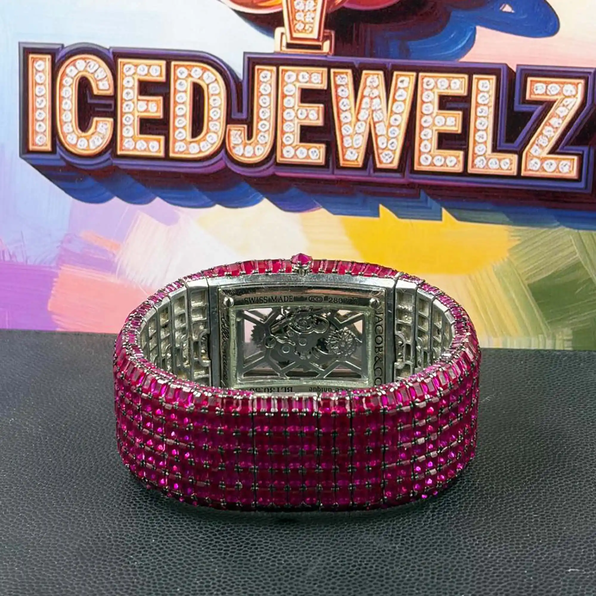 Elevate your wrist game with the signature icedjewelz custom time-piece. This stunning “Tank” style watch is meticulously handset with premium pink baguette-cut moissanite stones, offering a fire and brilliance that rivals traditional diamonds. Featuring a transparent skeleton dial that showcases the internal movement, this watch is the ultimate statement of luxury and craftsmanship.