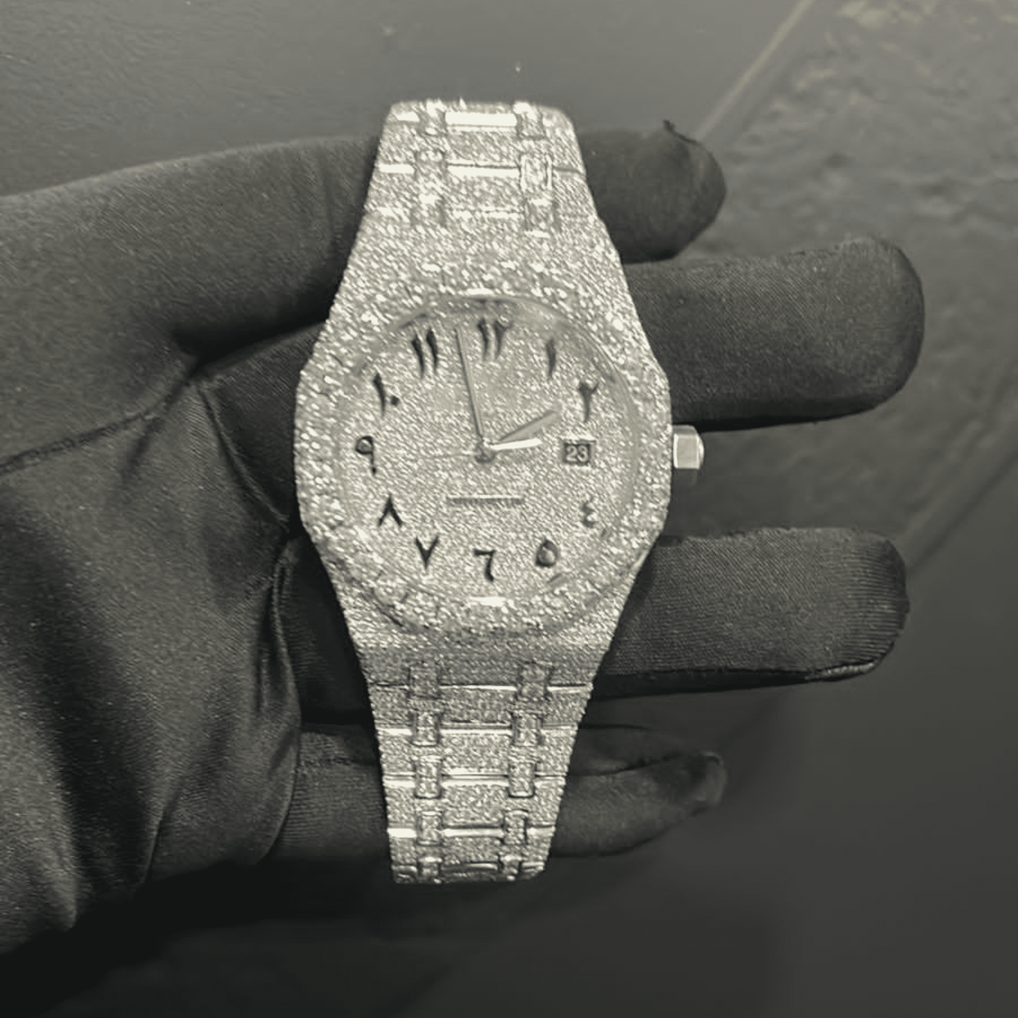 - Iced out with D-color, VVS moissanite stones