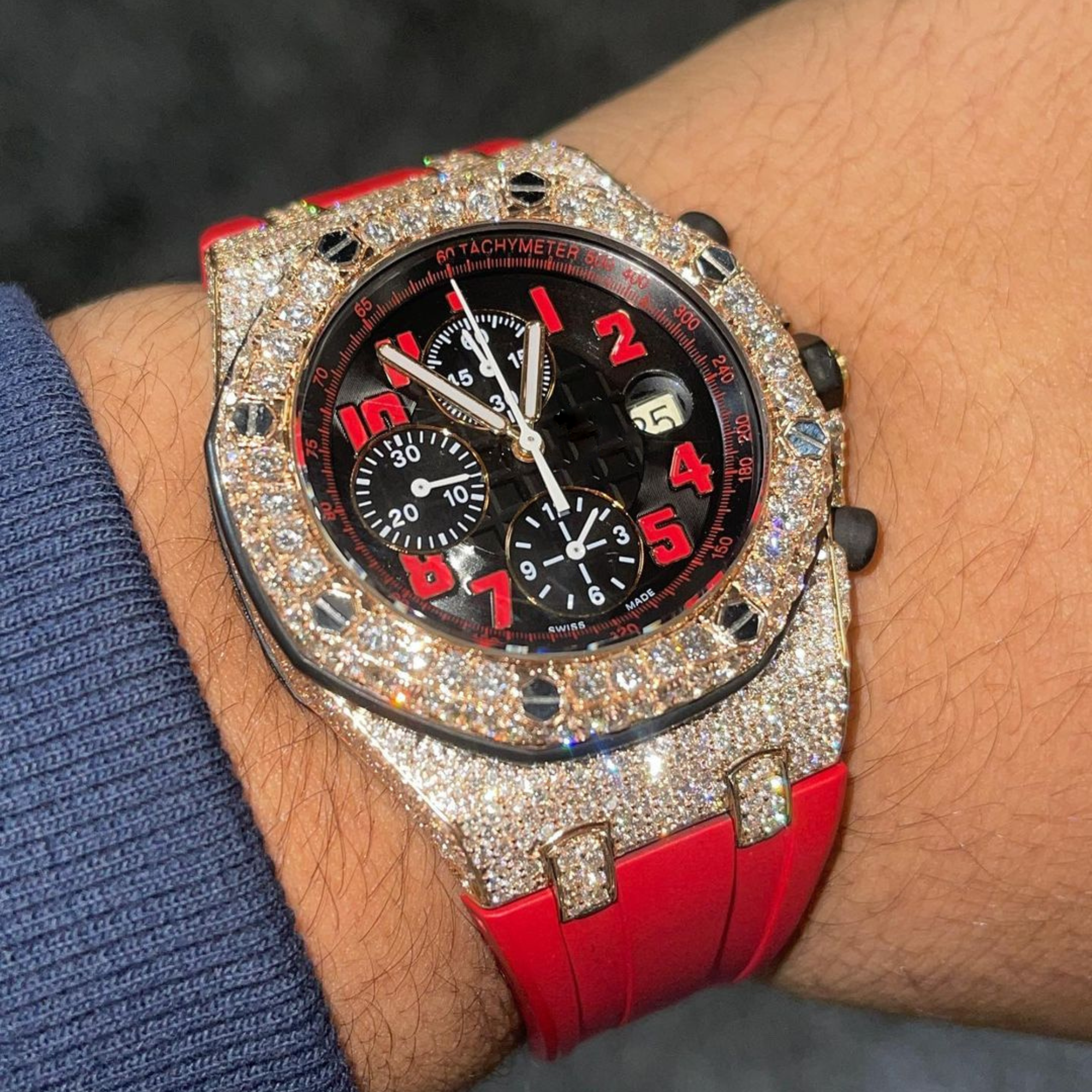 • The Blue Revolution: The exclusive navy blue moissanite custom is a 2026 trend-setter. The contrast between the deep navy dial and the white VVS Moissanite creates a sophisticated, “Nautical Luxury” aesthetic.